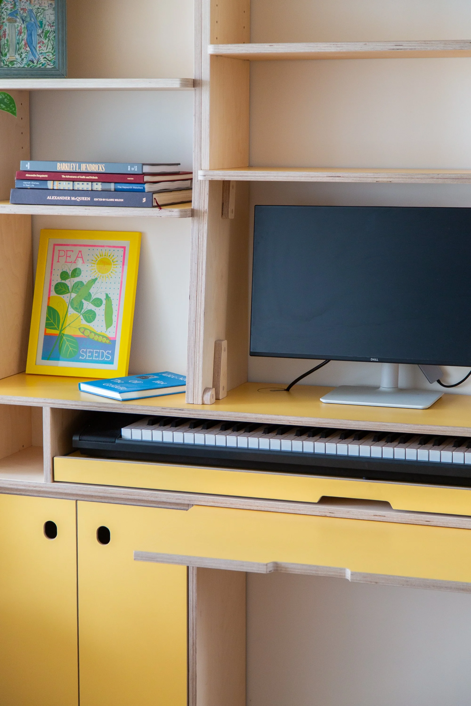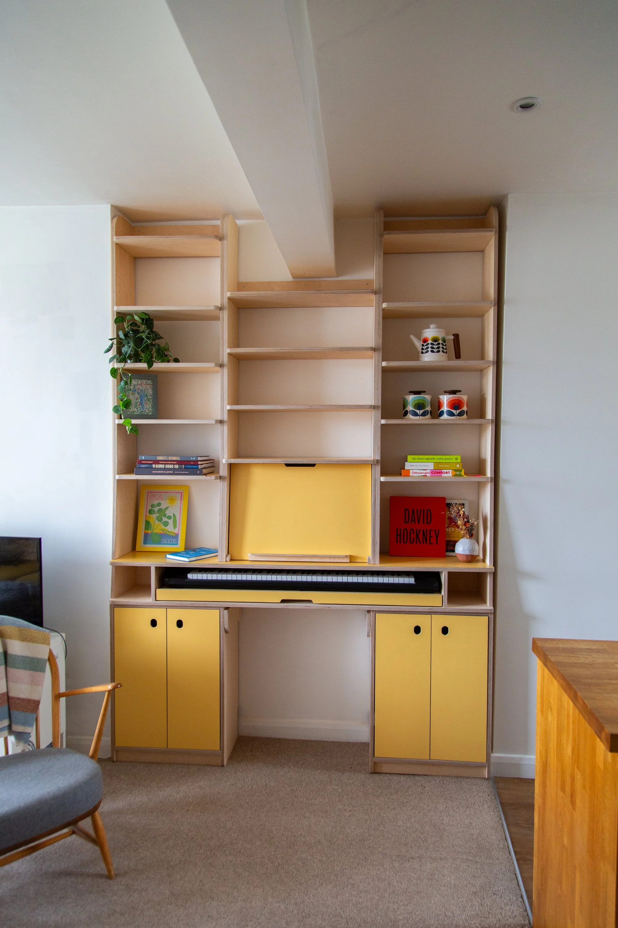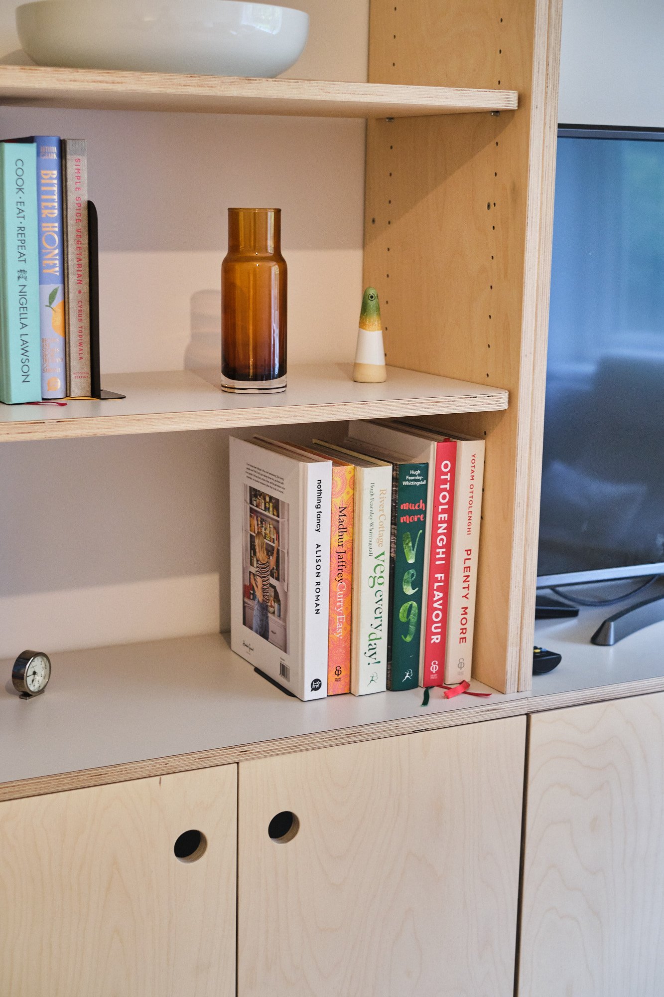 As the living room blends into the kitchen we kept everything quite shallow while leaving plenty of shelving left for her soft back books.