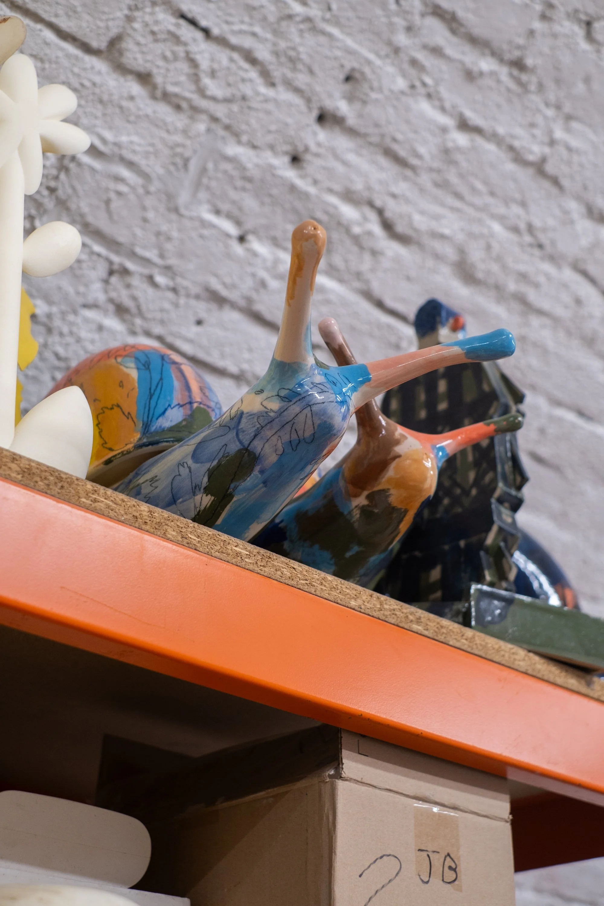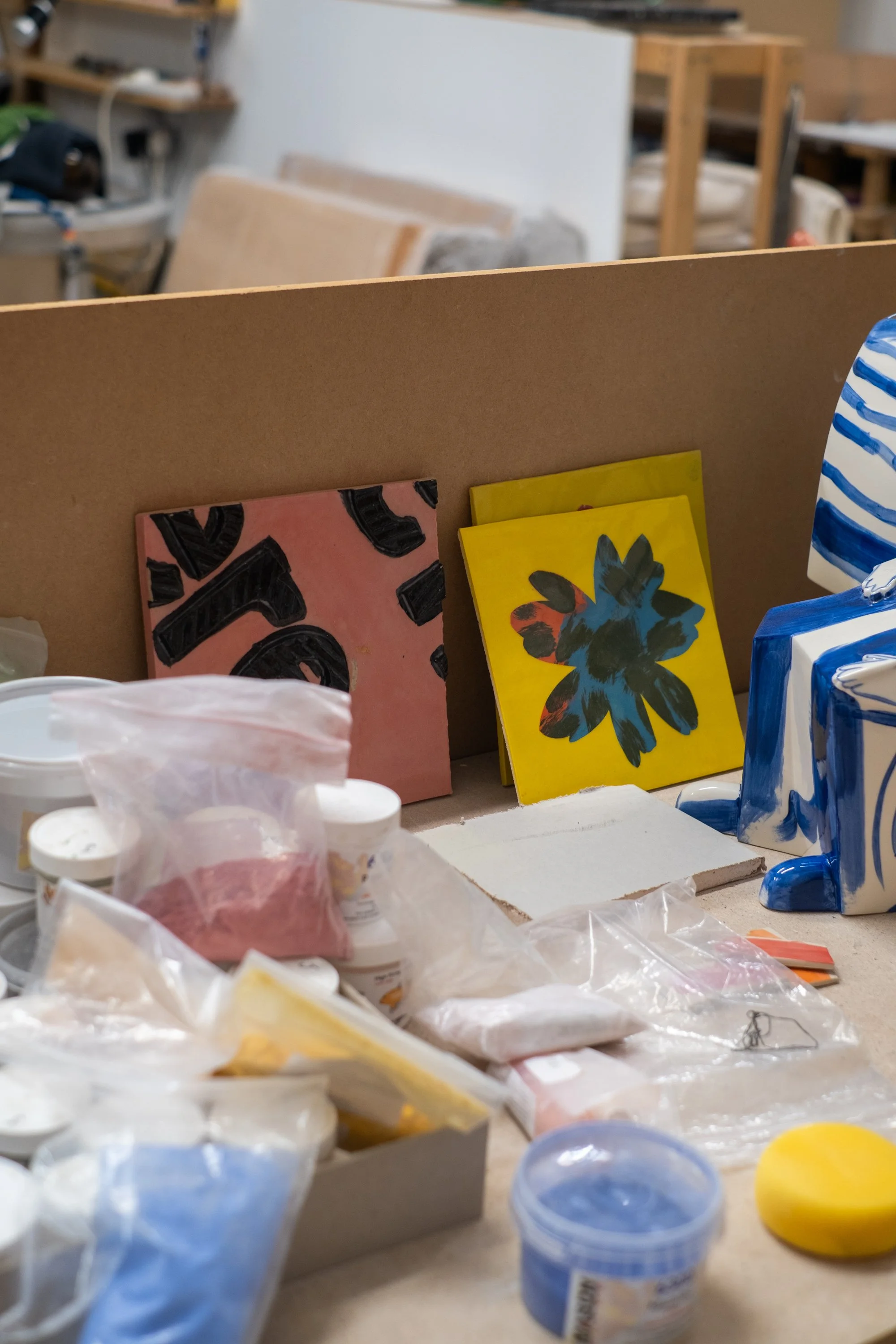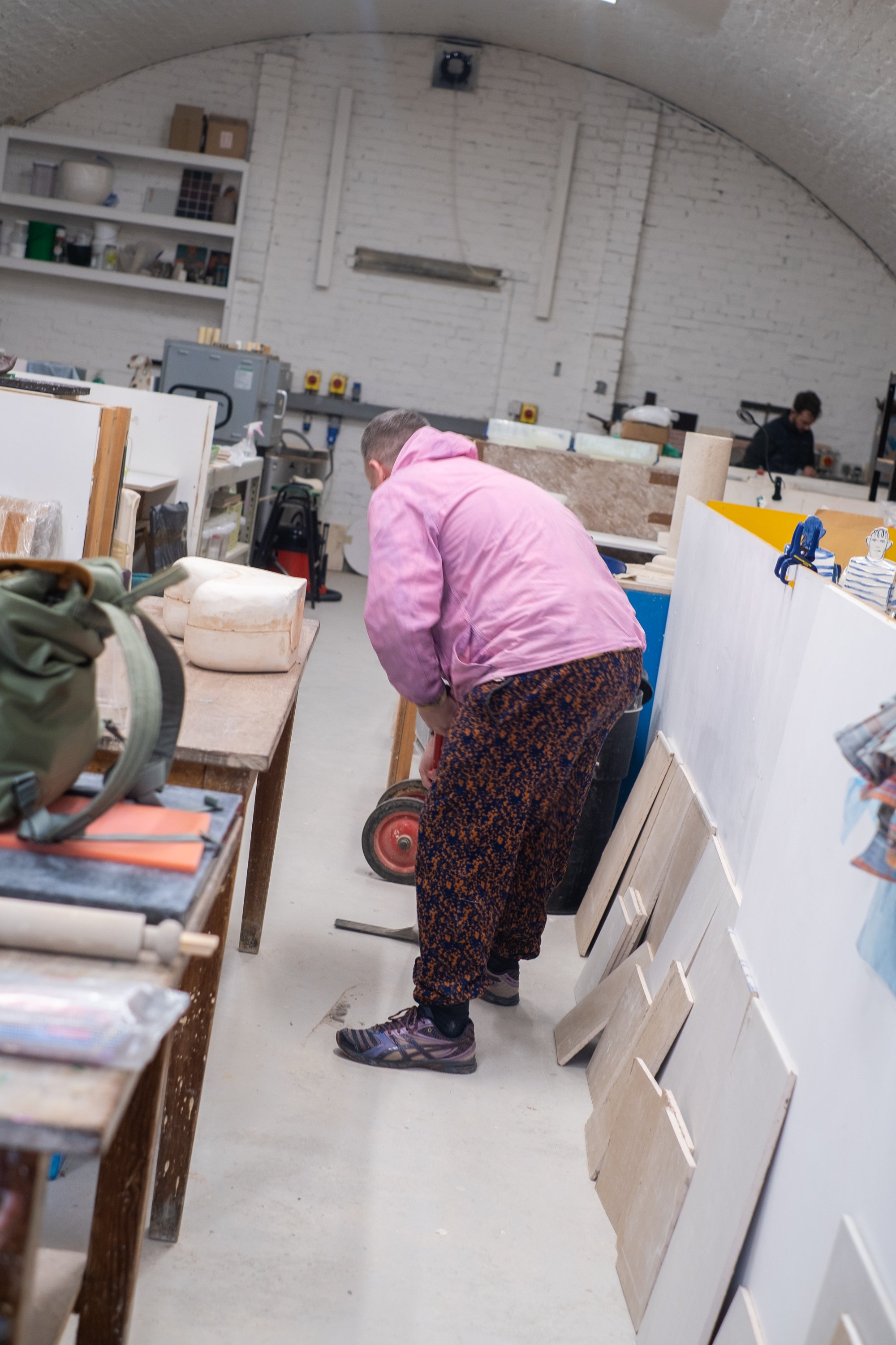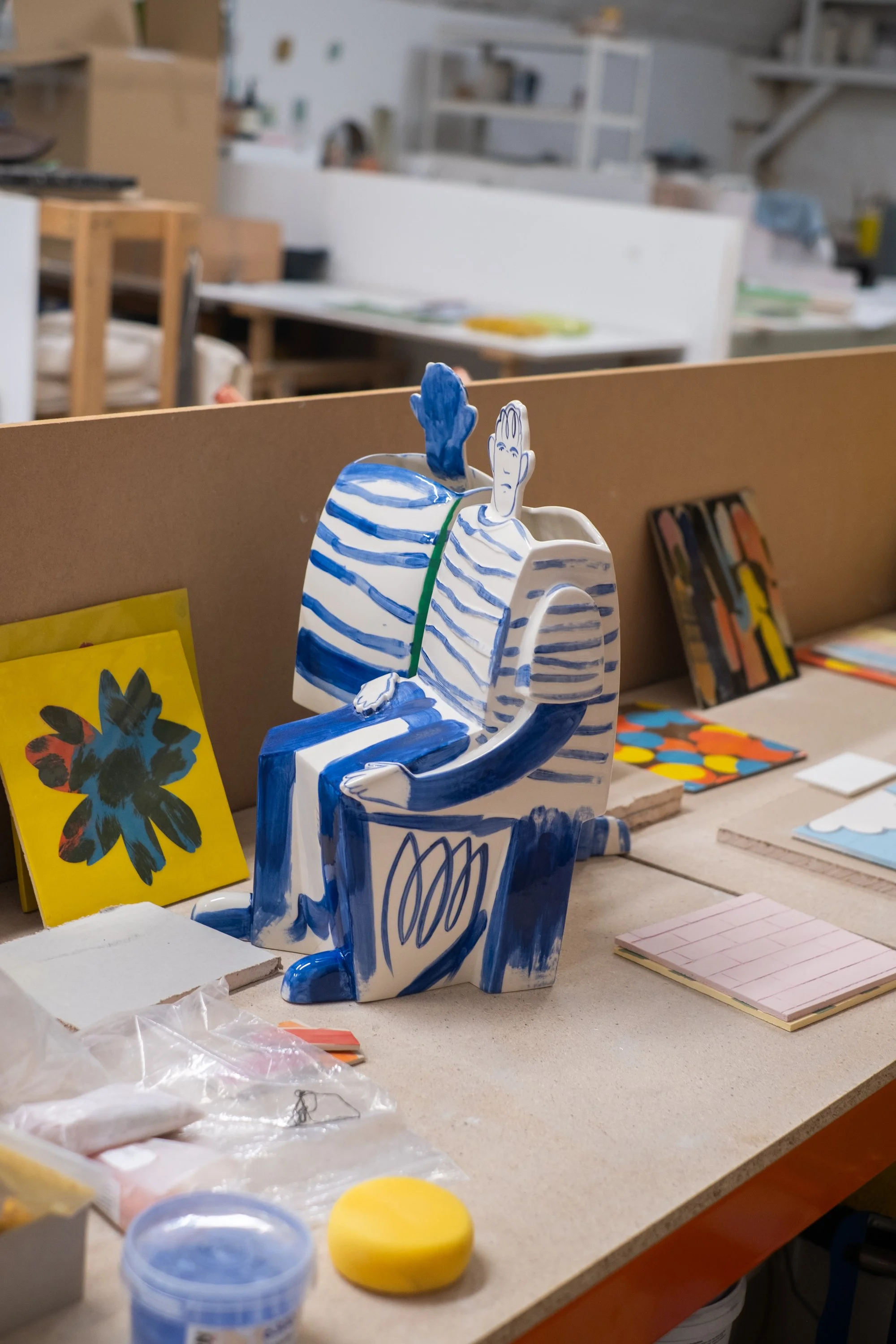 I visited John in his railway-arch studio in Haggerston, East London, a space he’s shared for the past nine years with seven other artists working across ceramics and mixed media. The studio has the feel of a home workspace: books, magazines and sketches are always within reach, feeding a constant loop of ideas.