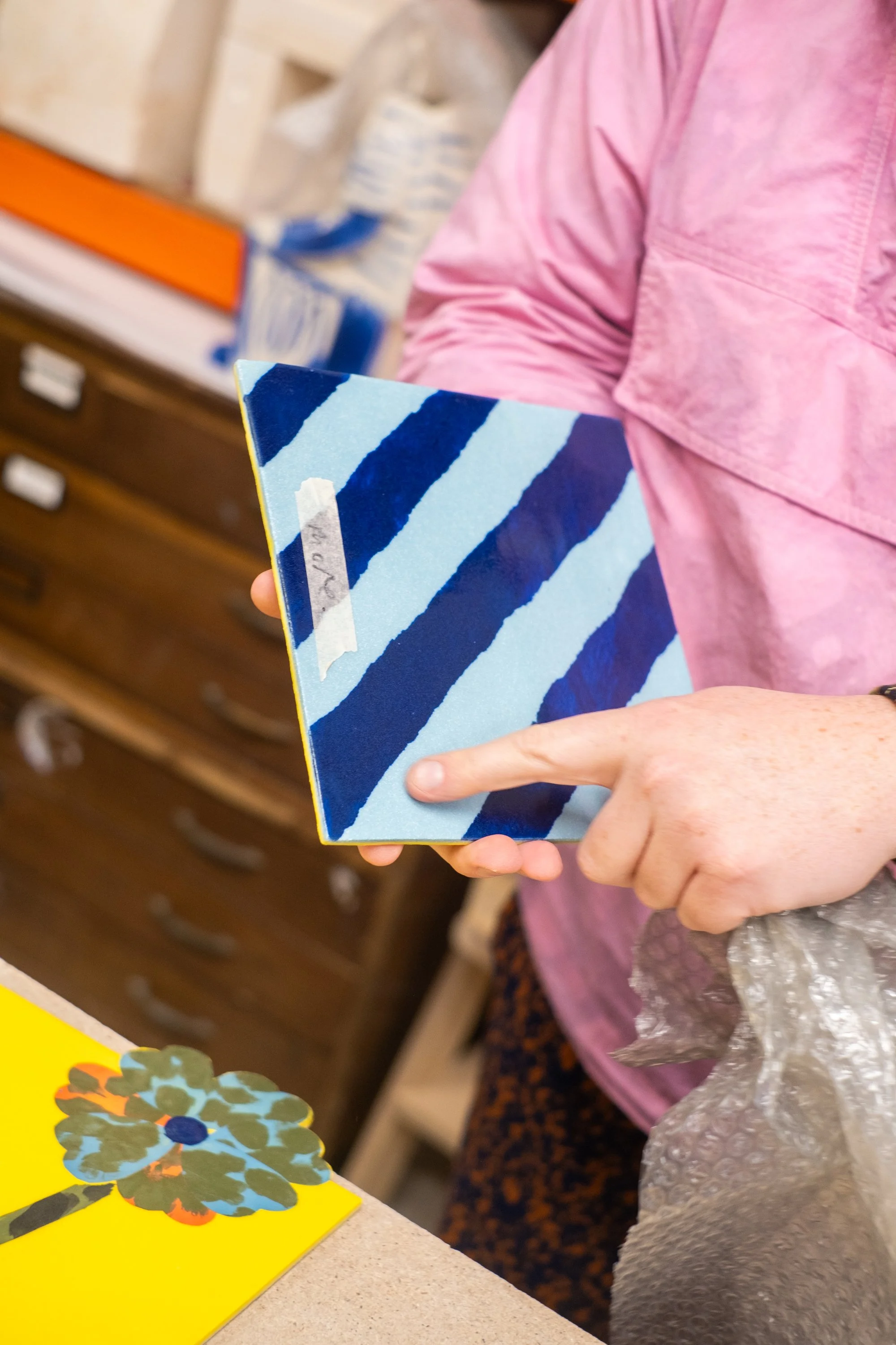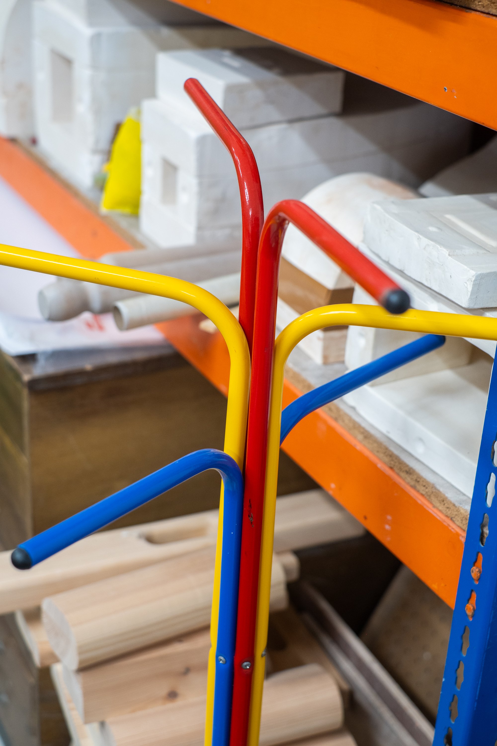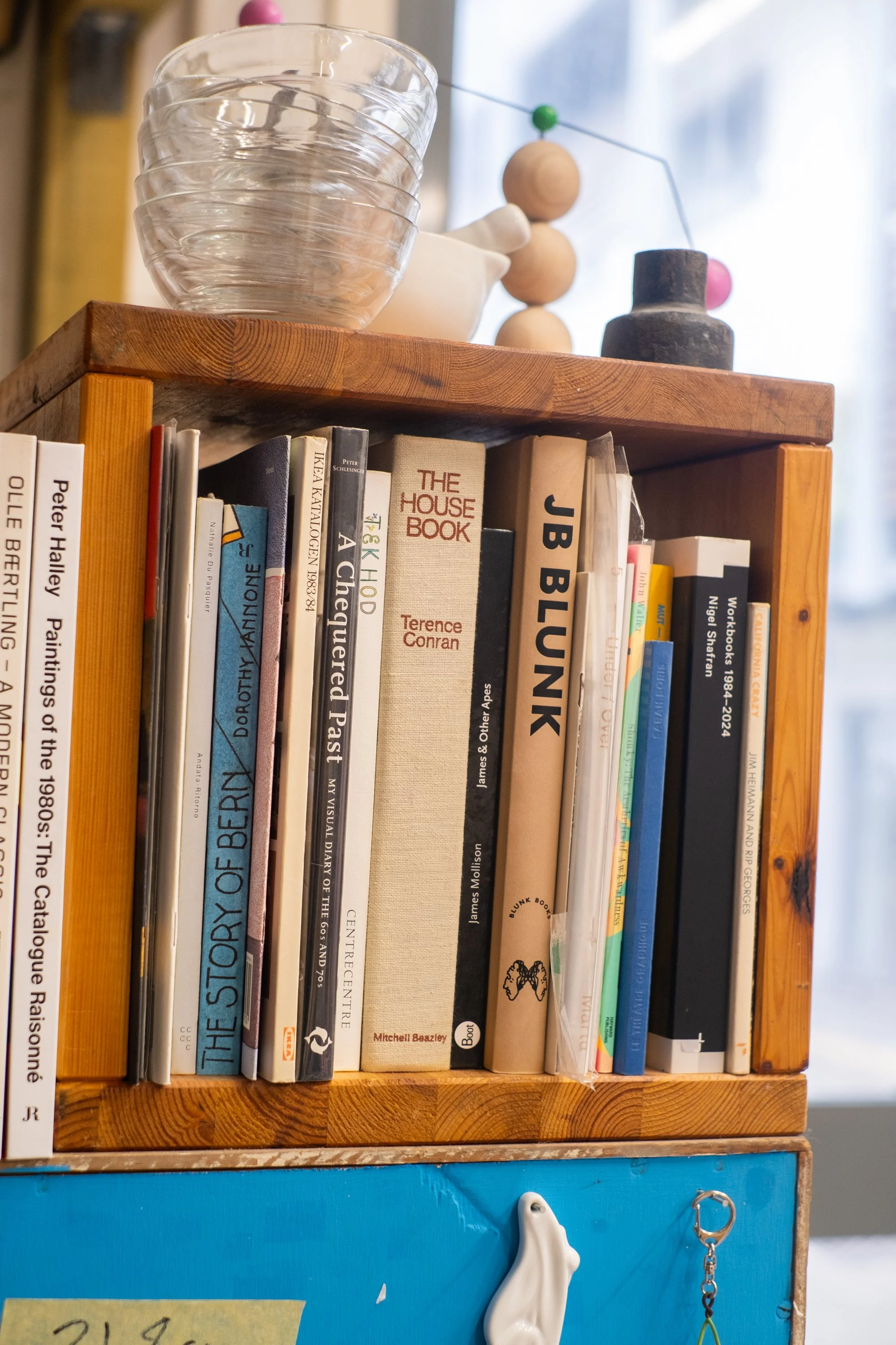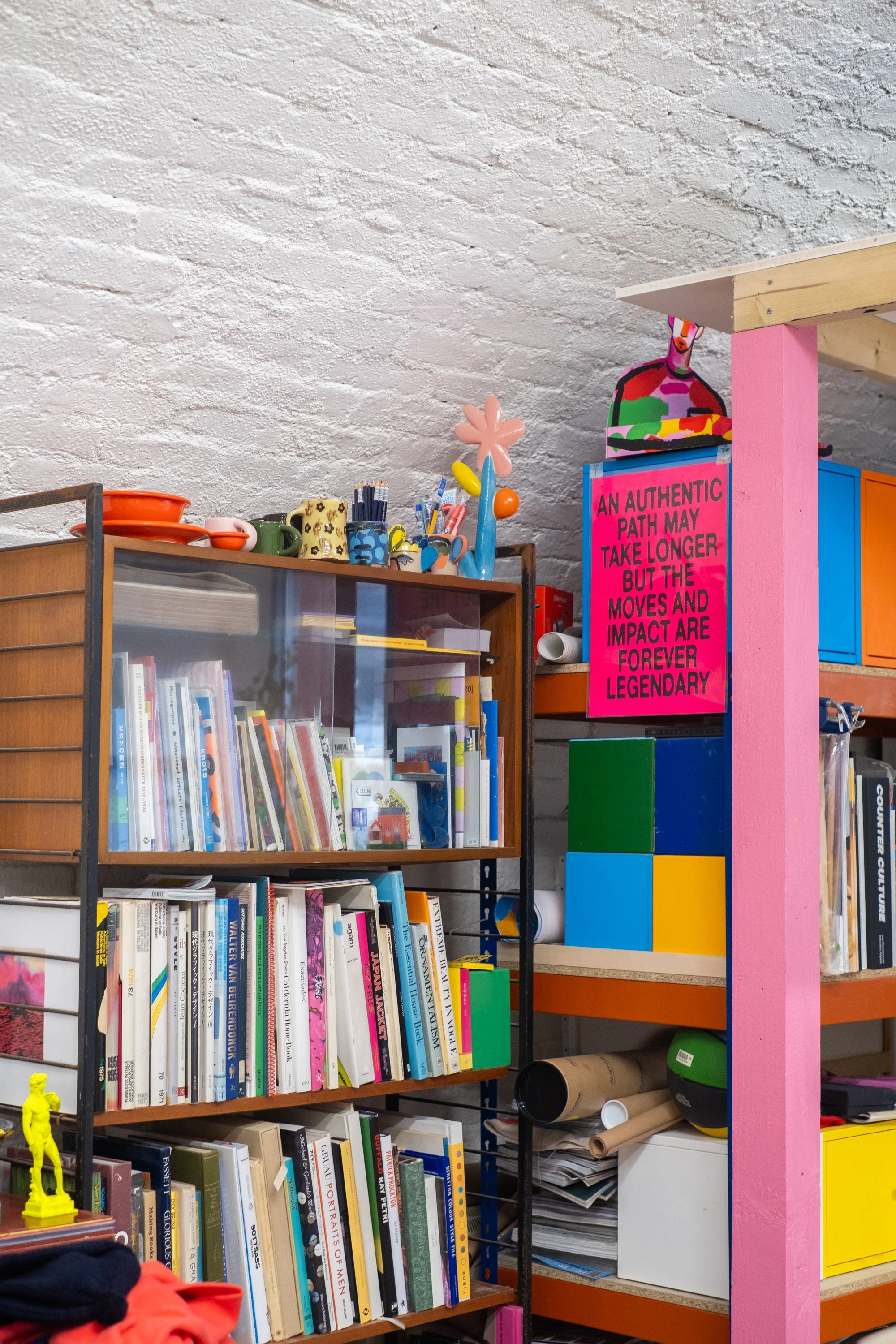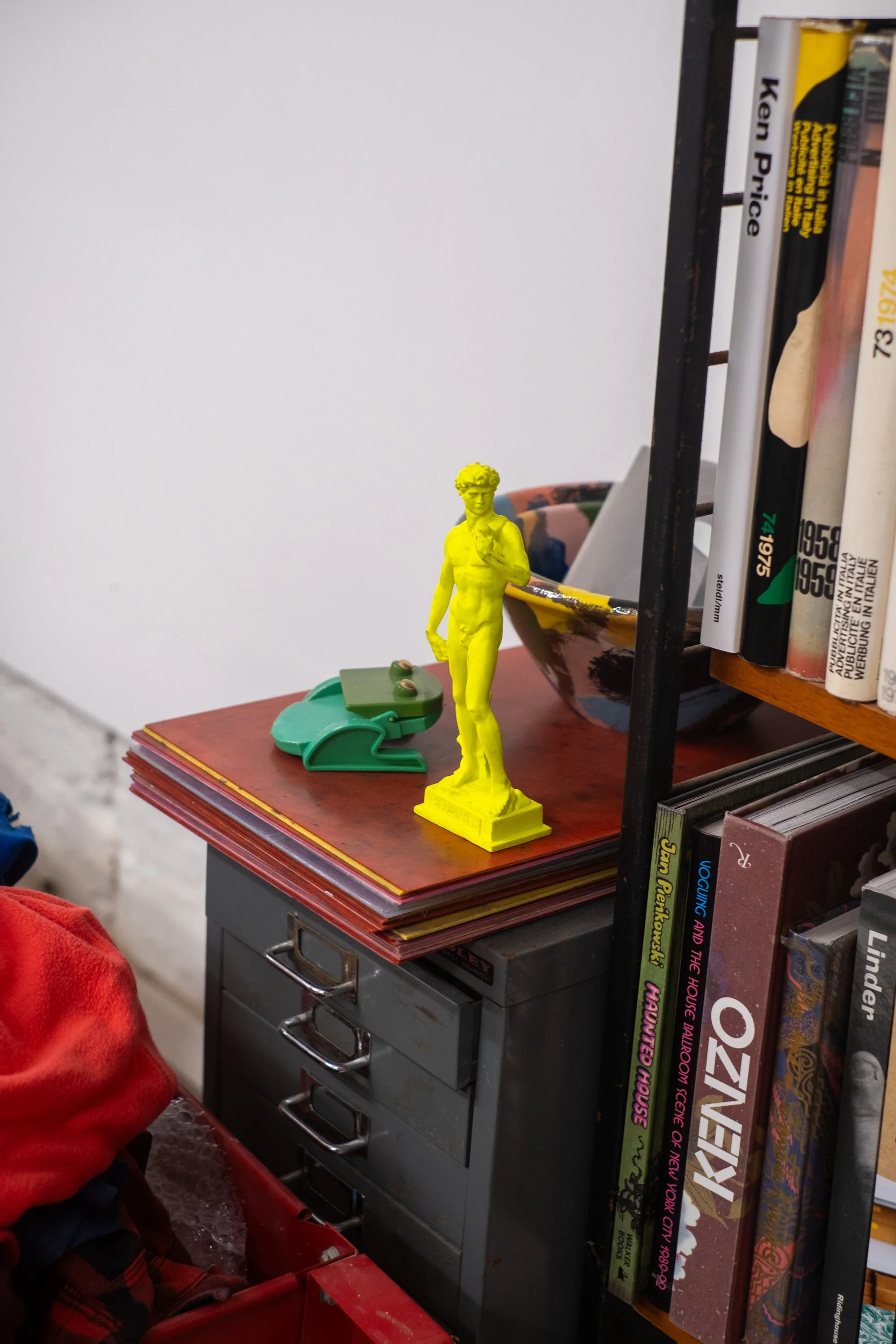John’s corner is a layered mix of practical workbenches, past projects, rammed bookshelves and plaster moulds, all sharing the signature pops of colour you’ll recognise from his work. His practice spans objects like egg cups and mugs through to fashion collections and large-scale murals for some of the world’s biggest fashion labels, including Fendi.