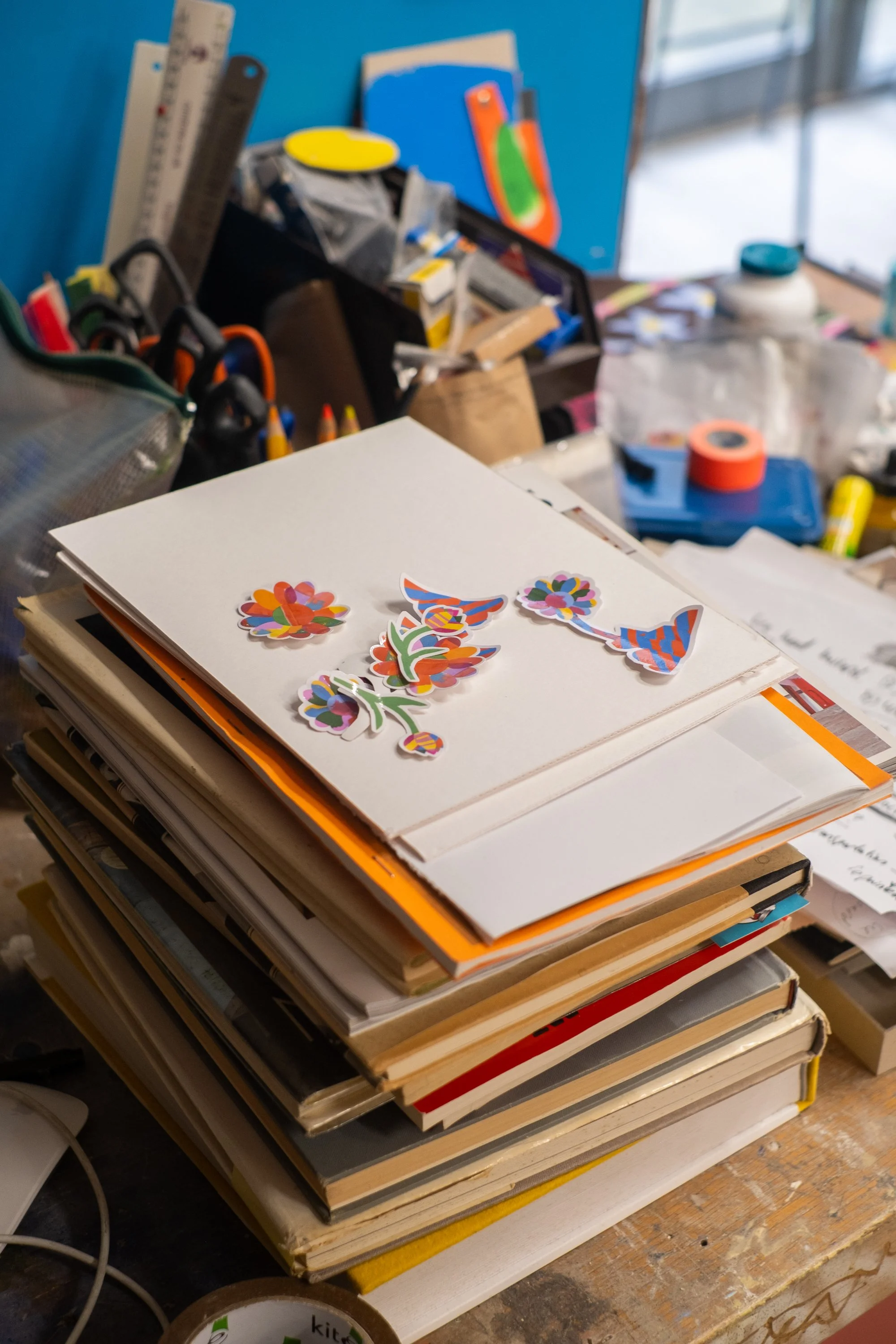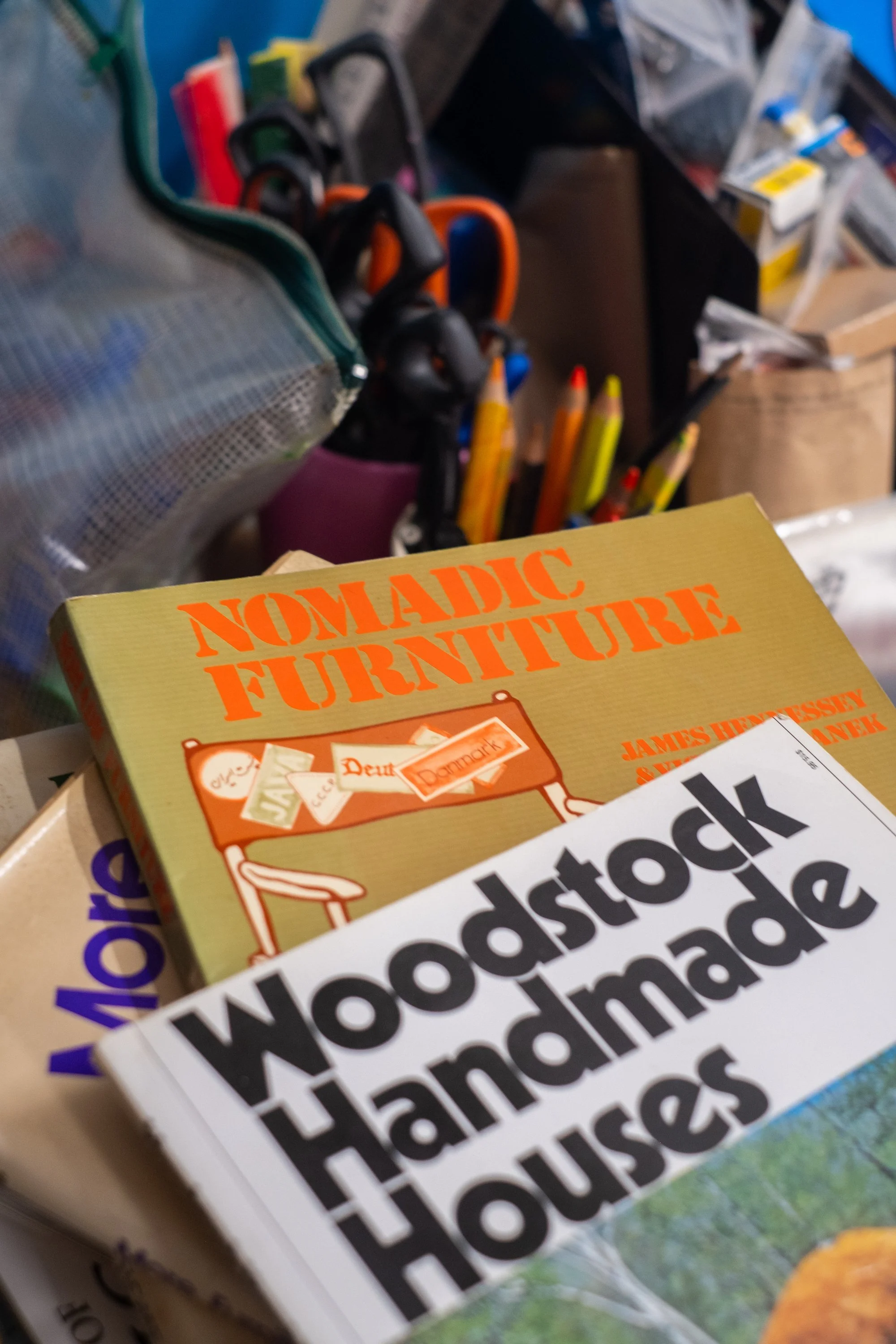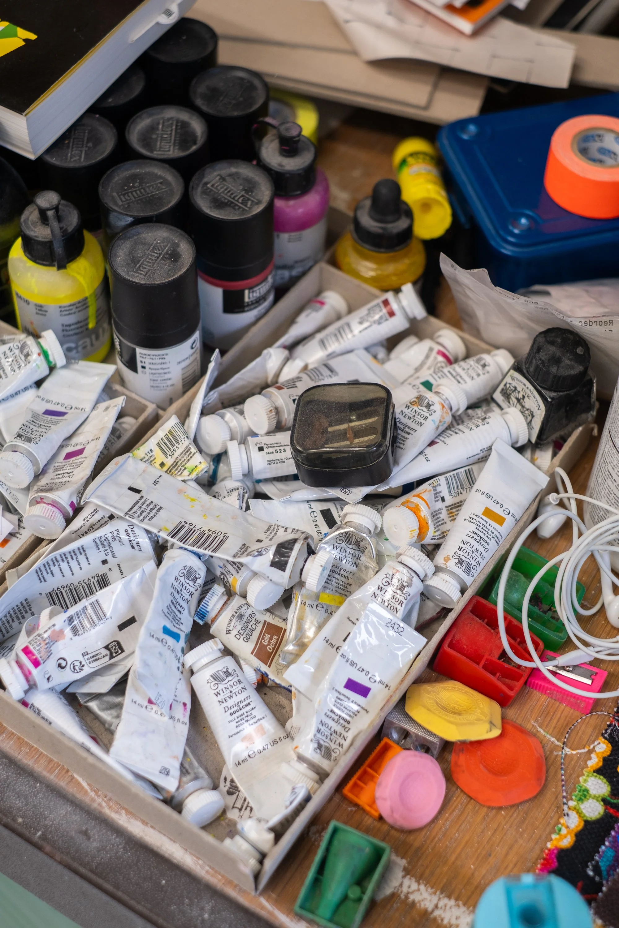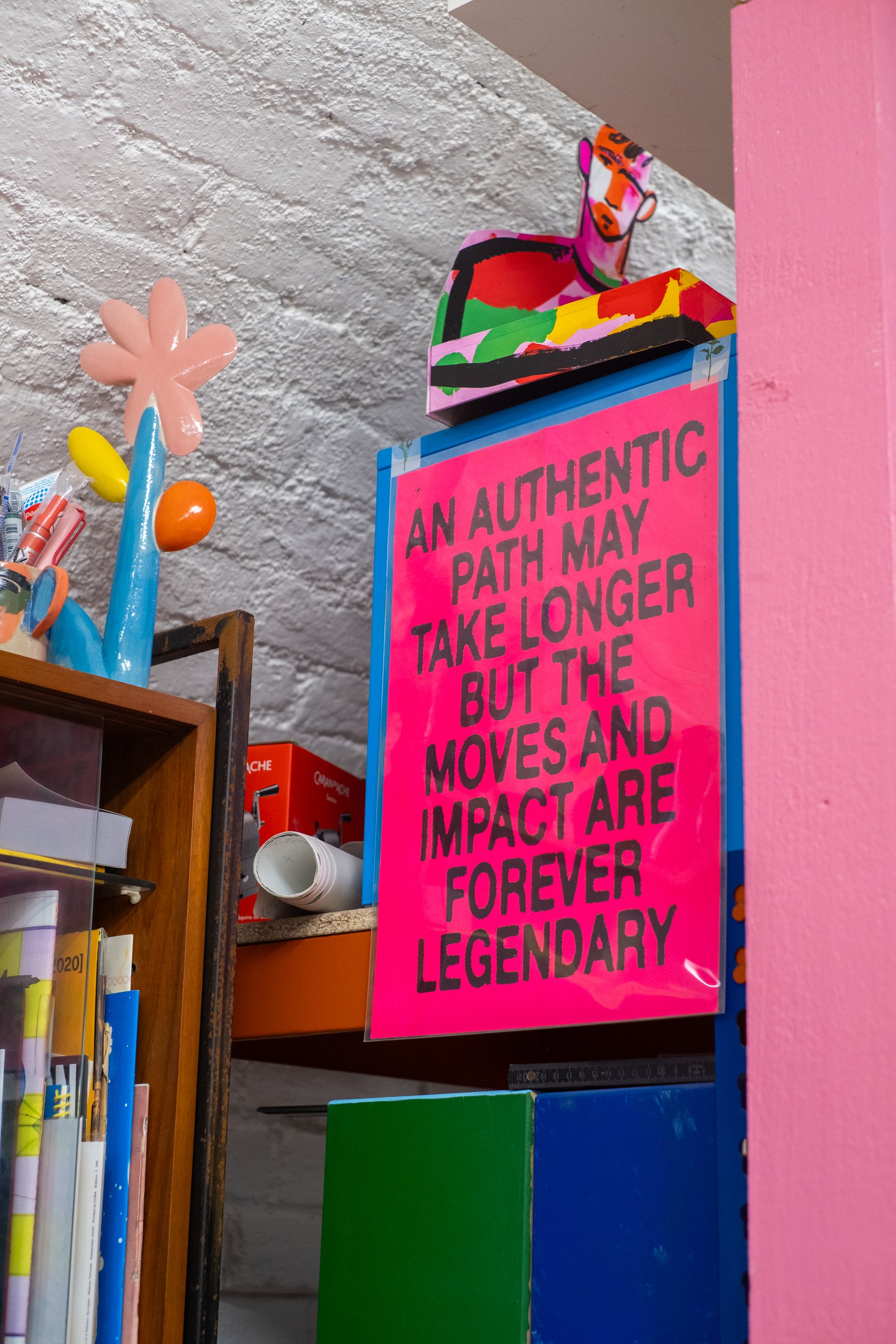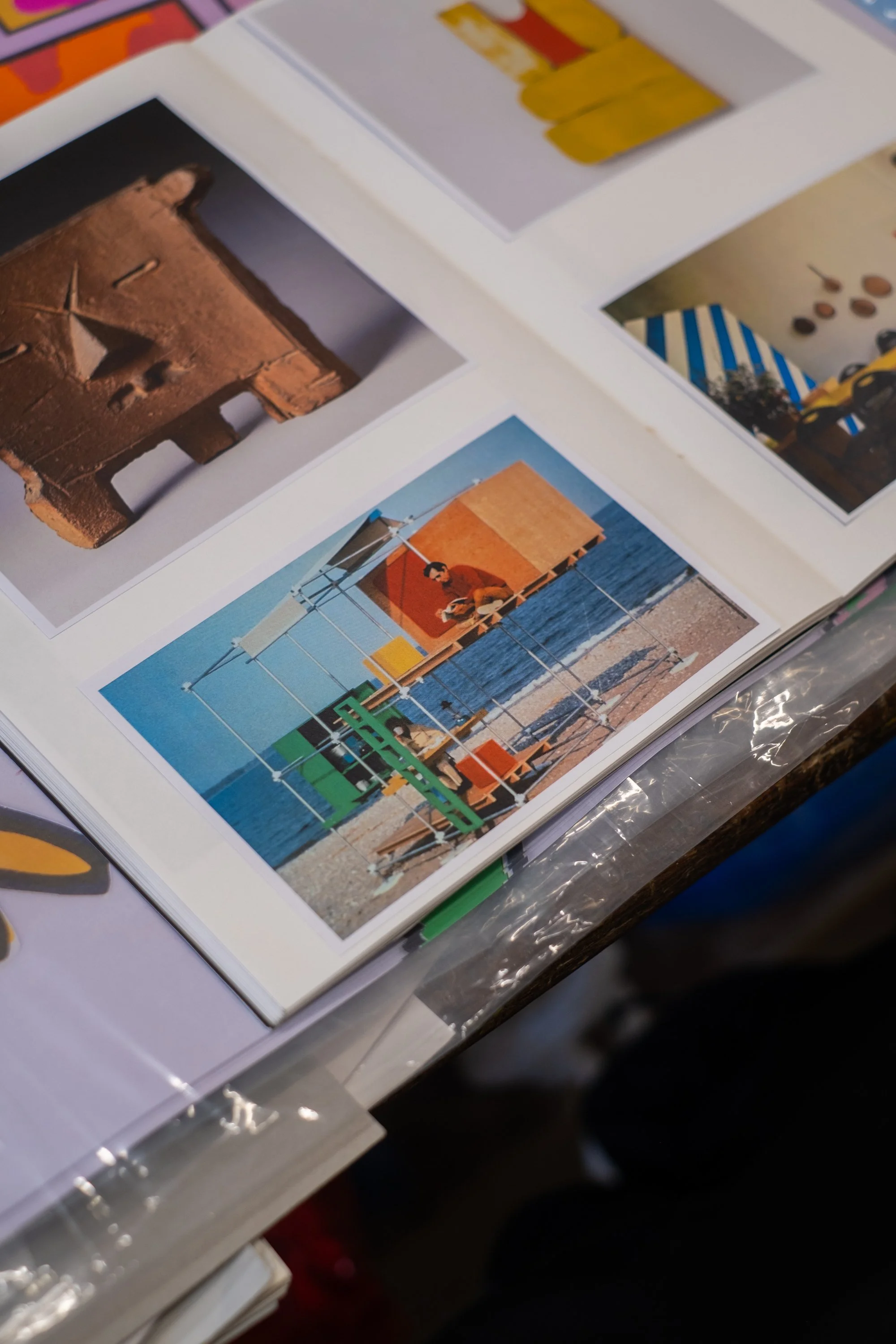 John’s corner is a layered mix of practical workbenches, past projects, rammed bookshelves and plaster moulds, all sharing the signature pops of colour you’ll recognise from his work. His practice spans objects like egg cups and mugs through to fashion collections and large-scale murals for some of the world’s biggest fashion labels, including Fendi.