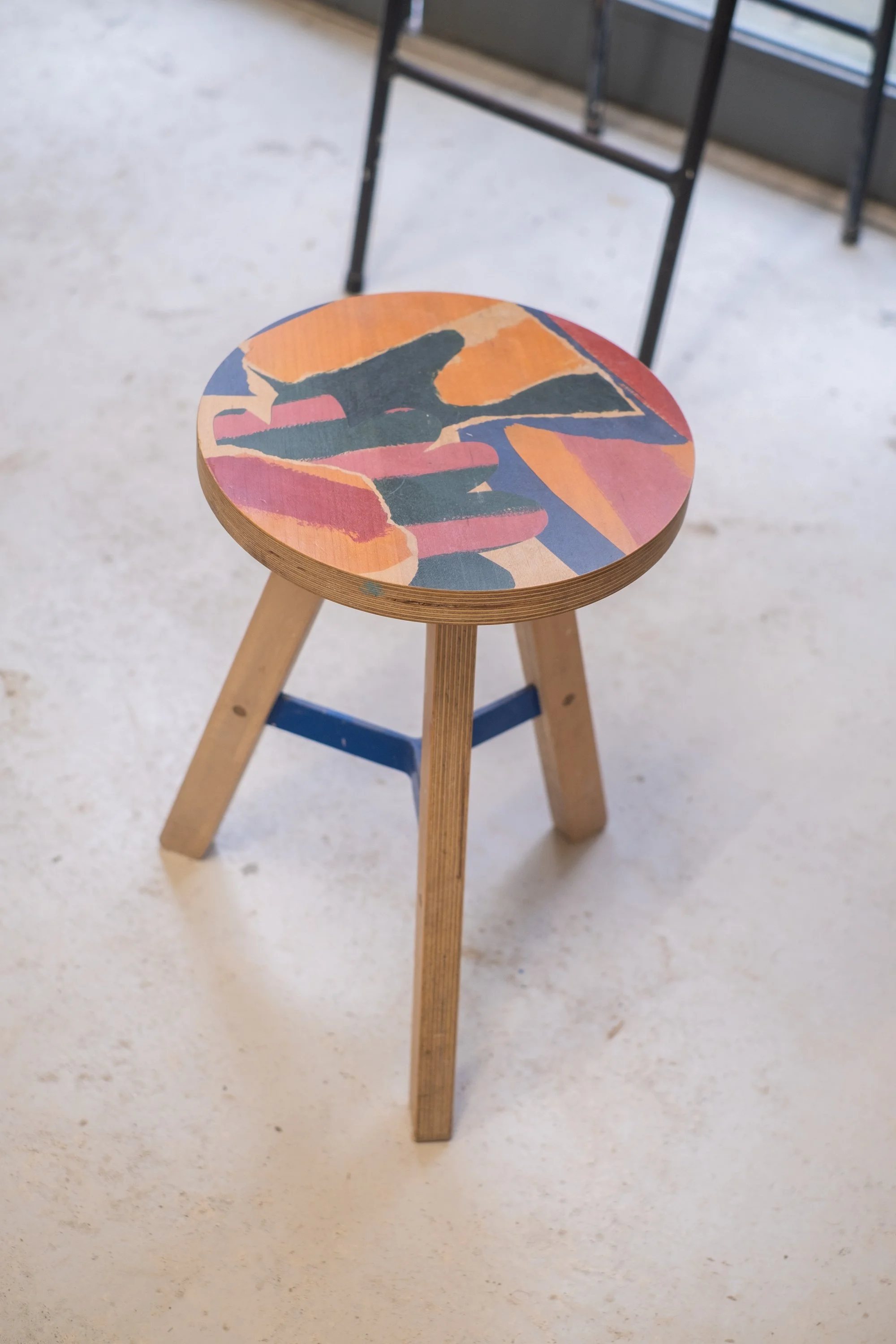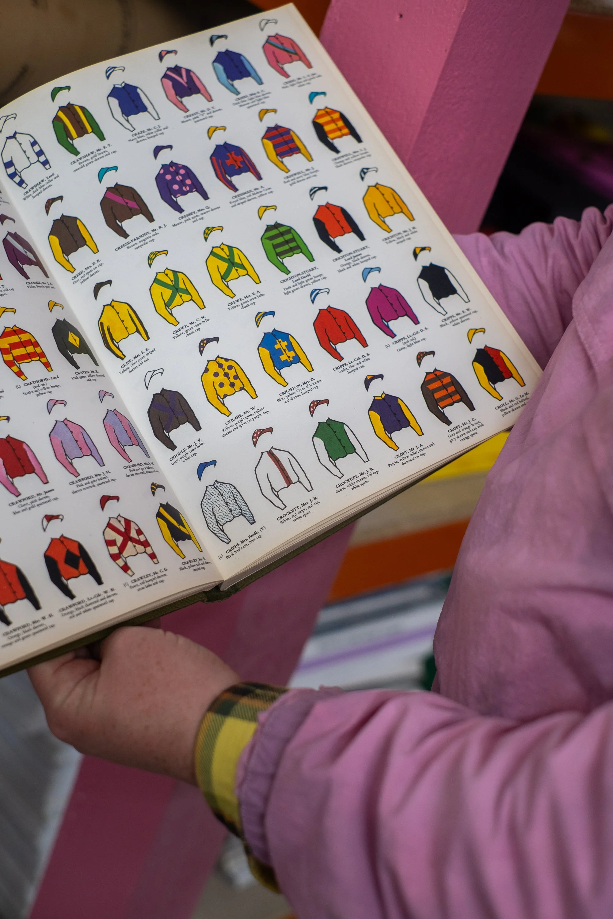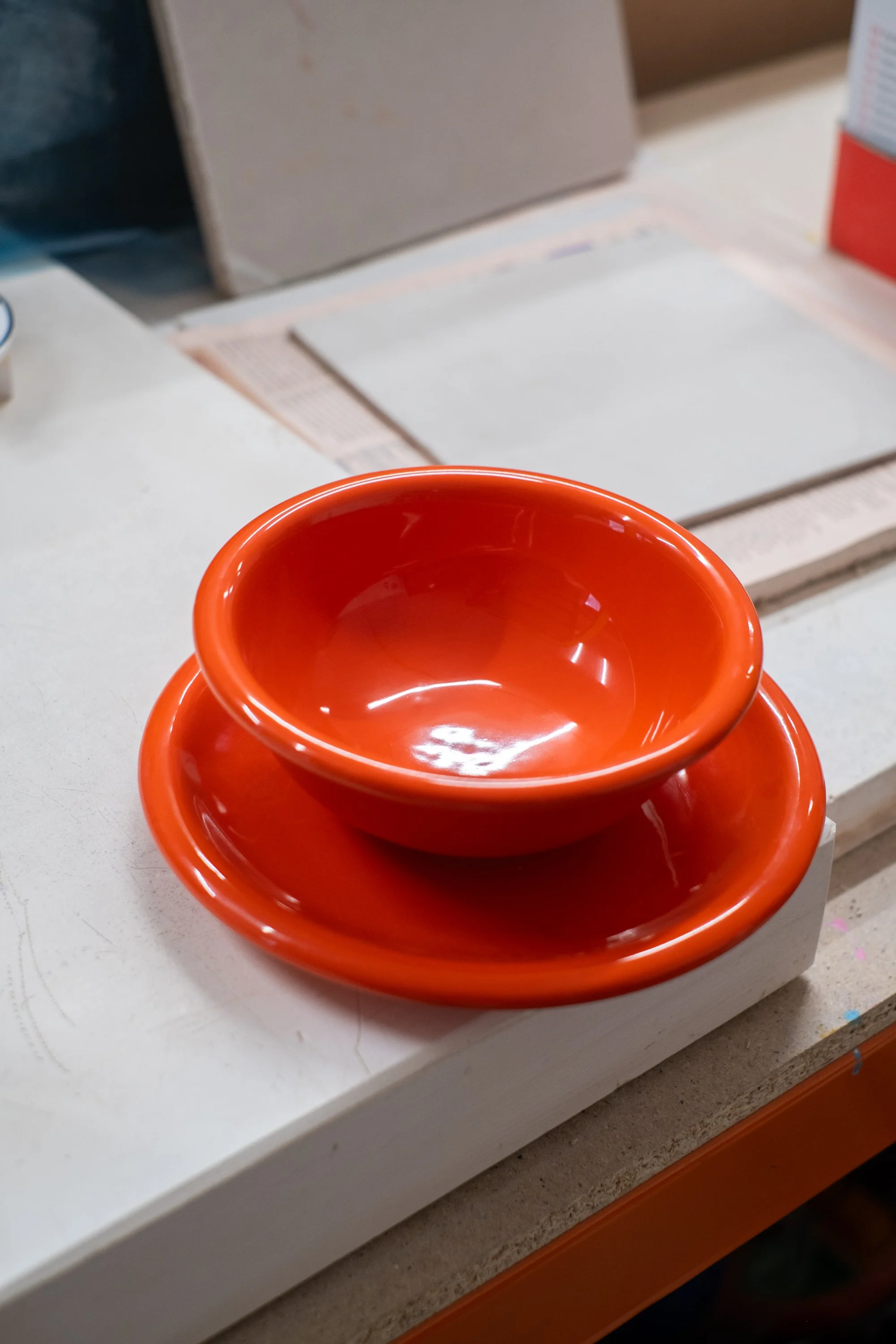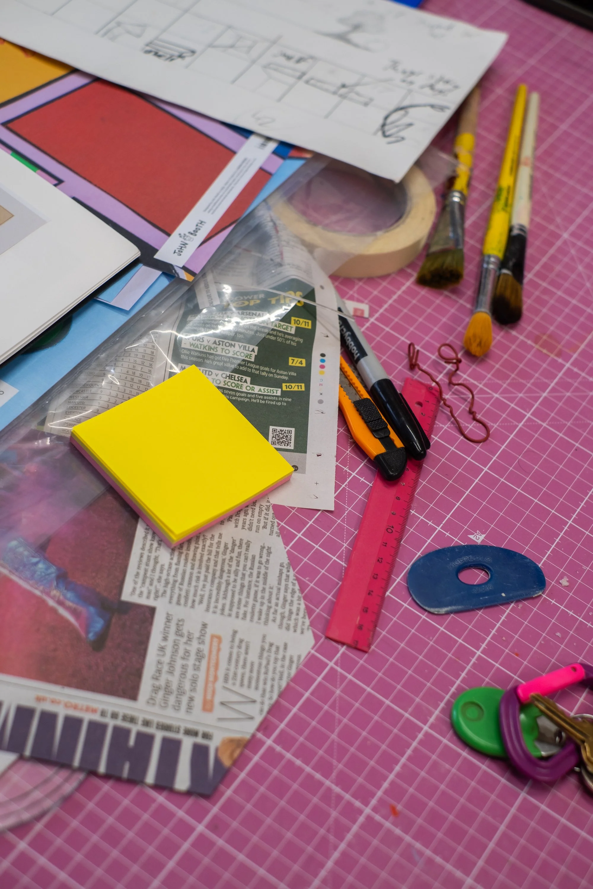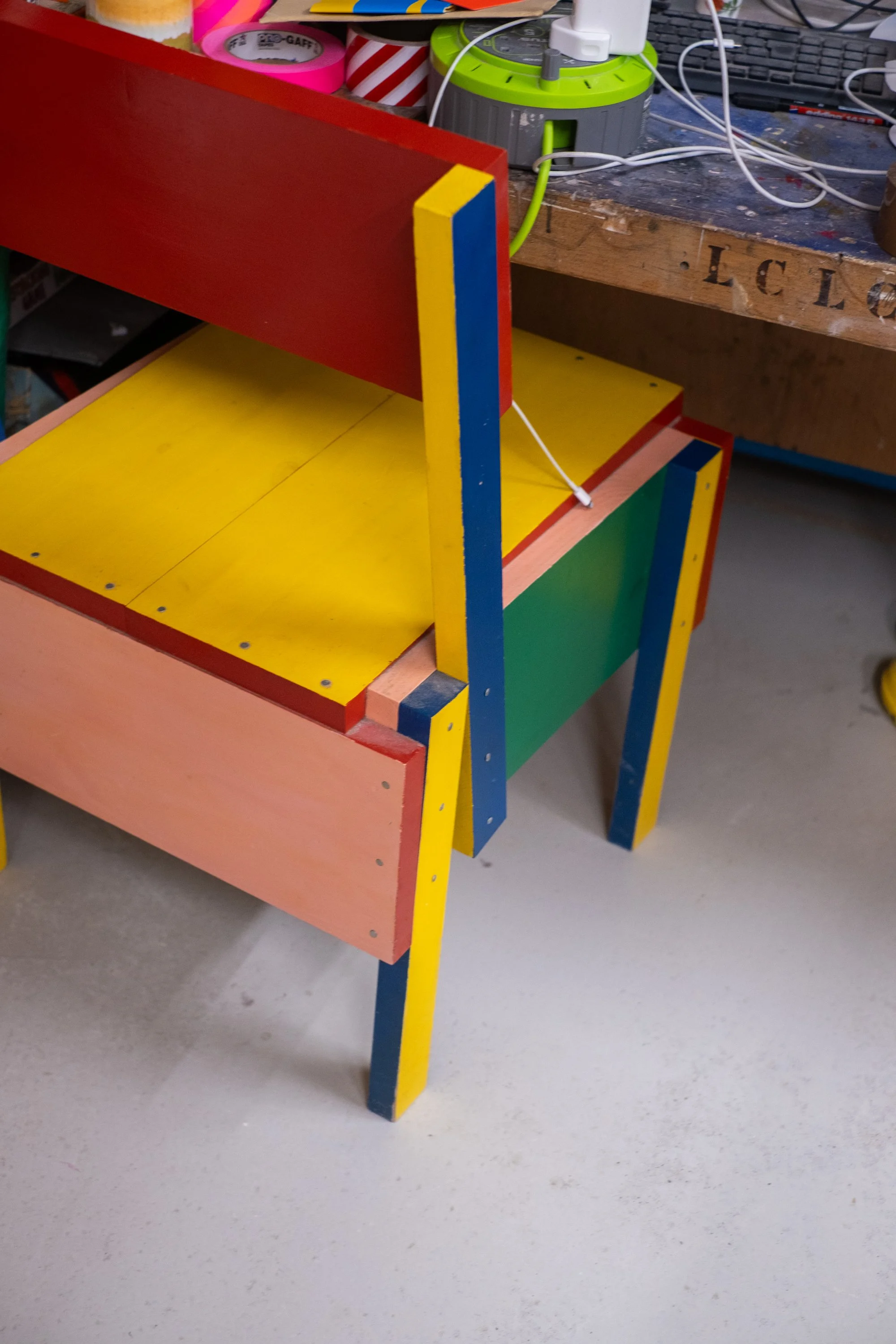 John’s corner is a layered mix of practical workbenches, past projects, rammed bookshelves and plaster moulds, all sharing the signature pops of colour you’ll recognise from his work. His practice spans objects like egg cups and mugs through to fashion collections and large-scale murals for some of the world’s biggest fashion labels, including Fendi.