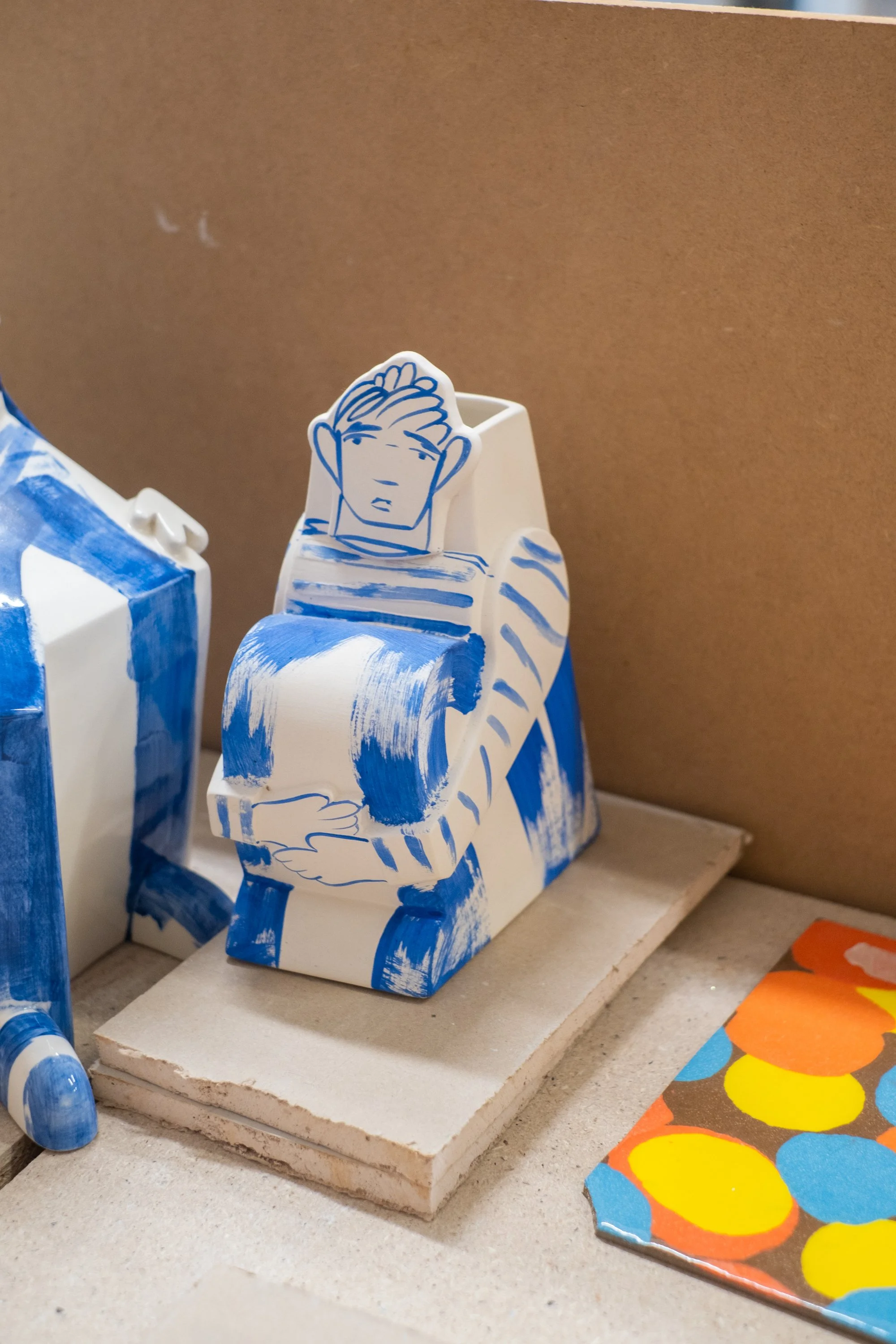 We spoke about John’s creative journey: moving from Cumbria to London to study Fashion Print Design at Central Saint Martins, working in-house for major fashion houses after graduating, and how a passing interest in a ceramics course gradually became the core medium for creating his work today.